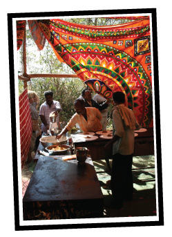 Dinner: Served with fragrant basmati rice, daal, sabji, raita, roti, kachumber, papadum & dessert.